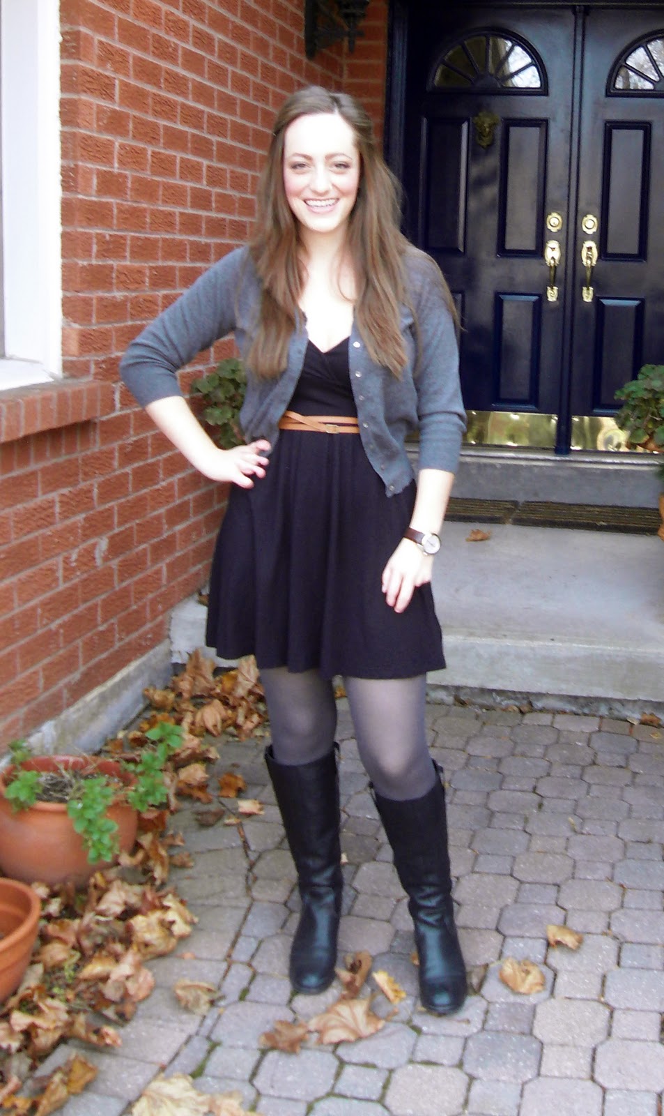 This dress is one of my favs because it's so versatile. In the summer, I'll wear it with a pair of sandals, a belt and a sun hat, but it's just as easy to style for colder weather. To keep warm I added a pair of grey tights (they are more opaque than they look in the picture) and a great cardigan from Joe Fresh. When you're picking a cardigan, make sure that it has a strong structure - look for clues like buttons, darts, seaming, etc - so that it doesn't loose it's shape.
